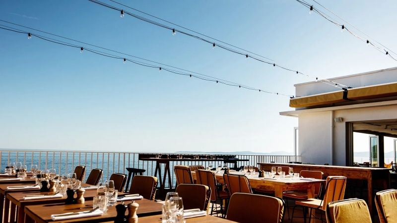 Nhà hàng ven biển với tầm nhìn ra đại dương bao la, hoàn hảo cho buổi tối lãng mạn