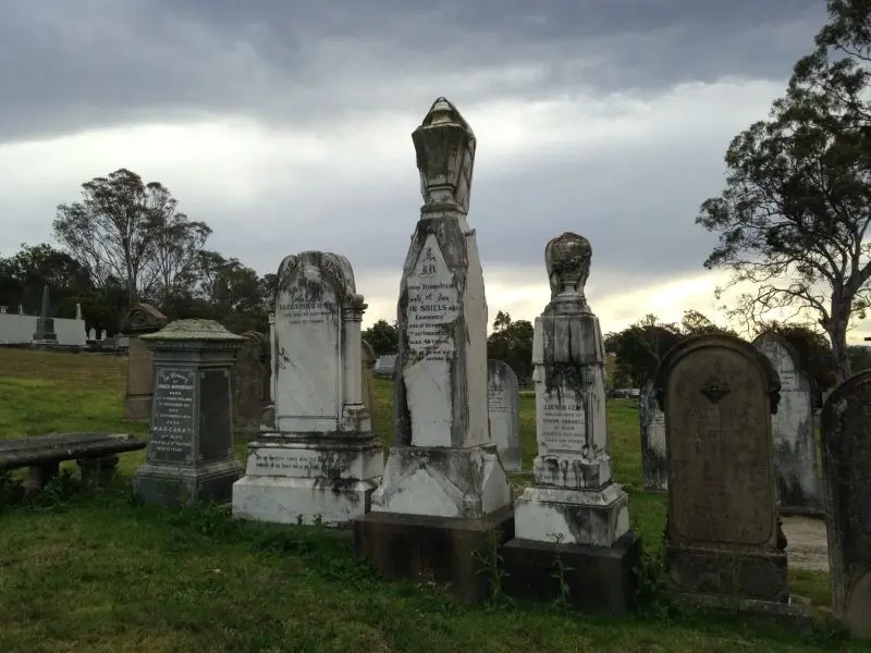 Phong cảnh nghĩa trang cổ với những bia mộ xưa, tạo nên một không gian huyền bí.
